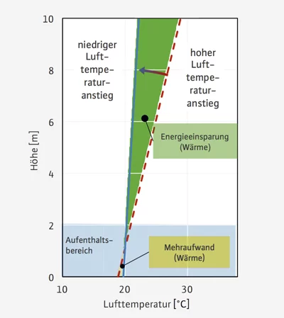 In sehr hohen beheizten Räumen kann sich durch thermischen Auftrieb der warmen Luft ein signifikanter Temperaturanstieg über der Höhe einstellen. Dies ist besonders bei rein konvektiven Heizsystemen zu beobachten. Die Aufheizung des bodennahen Aufenthaltsbereichs kann sich durch den Aufstieg der warmen Luft stark verzögern, während der Dachbereich unnötig überheizt wird. Die Überheizung des Dachbereichs deutlich über die notwendige Temperatur hinaus erhöht u. a. die Transmissionswärmeverluste des Gebäudes.