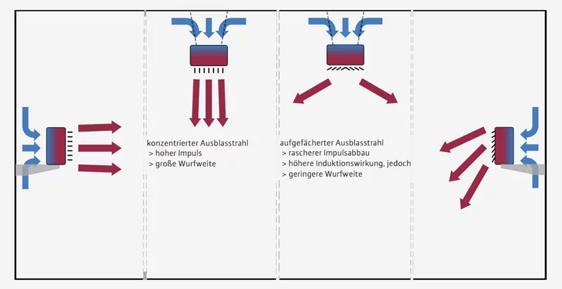 Hinsichtlich der Ausblasrichtung innerhalb des zu beheizenden Raums kann grob zwischen seitlich / waagerecht und nach unten ausblasenden Luftauslässen unterschieden werden. Viele Luftheizsysteme werden mit einstellbaren Luftauslässen ausgeführt – sehr verbreitet bei Hallen-Luftheizungen sind Ausblasjalousien mit verstellbaren Lamellen. Diese erlauben sowohl das Neigen des konzentrierten Ausblasstrahls als auch seine Auffächerung für eine höhere Induktionswirkung sowie einen rascheren Abbau der Strömungsgeschwindigkeit oder das Anblasen eines größeren Flächenbereichs.
